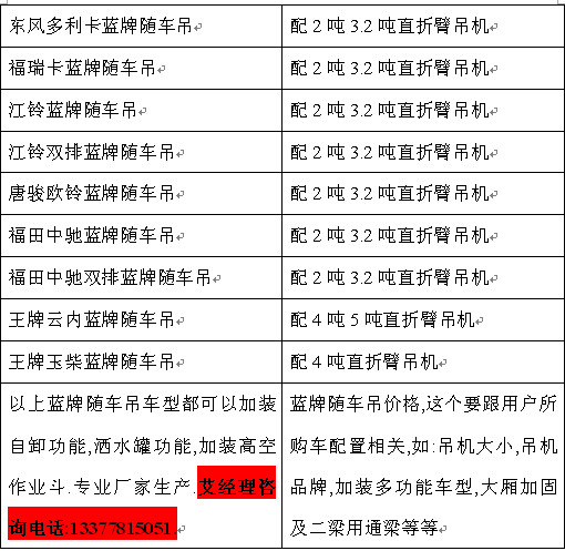 國Ⅴ藍(lán)牌隨車吊價格表也可以叫C證可駕駛的隨車吊,其品牌有東風(fēng)多利卡藍(lán)牌隨車吊,福瑞卡藍(lán)牌隨車吊,王牌藍(lán)牌隨車吊,唐駿歐鈴藍(lán)牌隨車吊,江鈴藍(lán)牌隨車吊,福田中馳藍(lán)牌隨車吊,藍(lán)牌隨車吊價格這是個很敏感的詞,作為一名買車的用戶最關(guān)心的問題,又想買到最好品牌藍(lán)牌隨車吊,又想買到最便宜藍(lán)牌隨車吊,專業(yè)起重運(yùn)輸車銷售艾經(jīng)理告訴廣大用戶,只有到專業(yè)廠家才能買到--湖北程力銷售艾經(jīng)理.