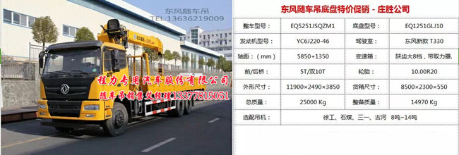 10噸12噸14噸后雙橋東風隨車吊EQ5251JSQZM1型隨車起重運輸車東風后雙橋隨車吊YC6J220-46 :這款東風后雙橋隨車吊的大梁300,1000的鋼絲胎,八檔箱,新款駕駛室,玉柴220國四國五發(fā)動機,8500×2300×550的大廂長度,可以在大廂里加個相應(yīng)的水罐。