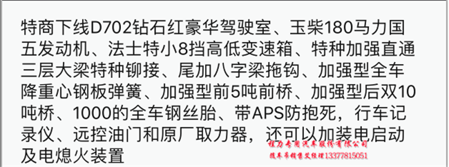 東風(fēng)特商隨車吊配置:東風(fēng)牌EQ5166JSQF型隨車起重運(yùn)輸車EQ5166JSQFVJ(4×2)東風(fēng)特商164000.00玉柴YC6J180-52發(fā)動(dòng)機(jī)國五排放國五隨車吊,陜齒小八檔8JS85E變速箱、帶取力器,5噸前橋10噸后橋,300mm通三層,10.00R20鋼絲胎,帶動(dòng)轉(zhuǎn)、排氣制動(dòng)、斷氣剎,帶ABS和下防護(hù)。D913新款豪華排半駕駛室。隨車吊價(jià)格與用戶要求有直接關(guān)系。