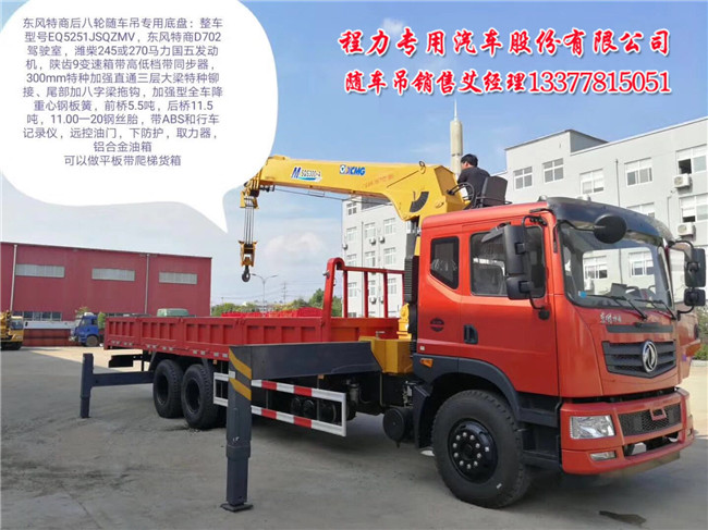 12噸10噸14噸東風特商后雙橋隨車吊整車型號:EQ5251JSQZMV-東風D702新款駕駛室. 濰柴245馬力(濰柴270馬力、YC6A240-50) 陜齒9JS119變速箱,300MM三層直通大梁.前加強型前5.5噸,后雙加強11.5噸(可選13噸后橋), 11.00全車鋼絲輪胎,原裝取力器。帶ABS和行車記錄儀. 遠控油門 .專用隨車起重機底盤。此底盤可以做隨車吊平板帶爬梯。