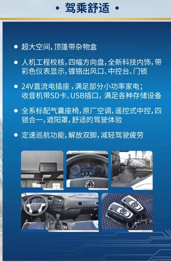 東風(fēng)華神F5隨車吊駕乘舒適:超大空間,頂篷帶雜物盒,人機工程校核,四幅方向盤,全新科技內(nèi)飾,帶彩色儀表顯示,鍍鉻出風(fēng)口,中控臺,門鎖.24V直流電插座,滿足部分小功率家電.收音機帶SD卡,USB插口,滿足各種存儲設(shè)備.全系標(biāo)配氣囊座椅,有空調(diào),遙控式中控,四鎖合一,遮陽罩,舒適的駕駛體驗.定速巡航功能,解放雙腳,減輕駕駛疲勞.