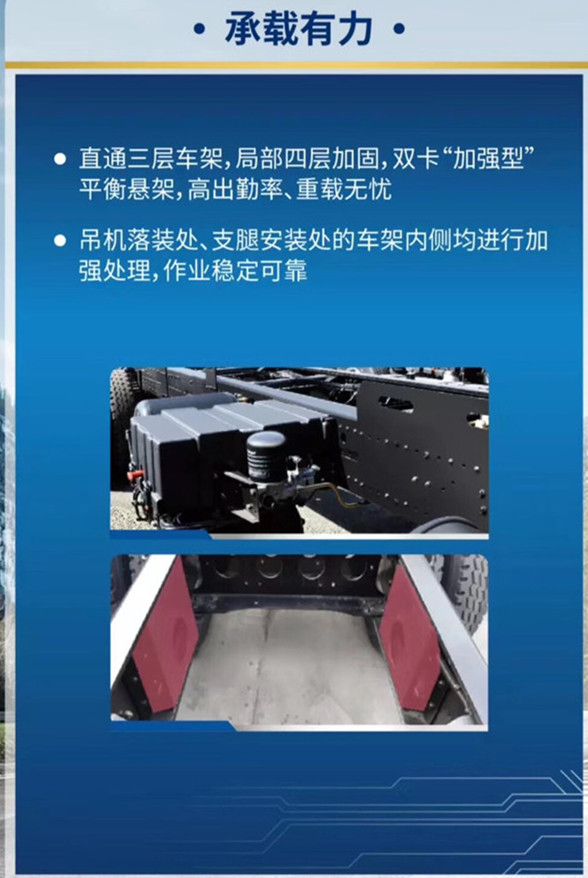 東風(fēng)華神F5隨車吊承載有力:直通三層大梁,局部四層加固,雙卡加強型平衡懸架,高出勤率,重載無憂.吊機落裝處,支腿安裝處的車架內(nèi)側(cè)均進行強處理,作業(yè)穩(wěn)定可靠.