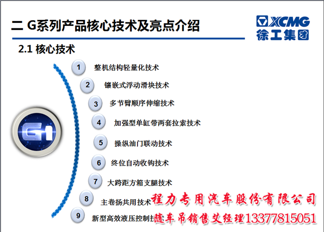 隨車吊配徐工14噸G型五節(jié)加長(zhǎng)臂G系列產(chǎn)品核心技術(shù)及亮點(diǎn)介紹:亮點(diǎn)介紹—浮動(dòng)滑塊技術(shù).新研發(fā)的鑲嵌式浮動(dòng)滑塊結(jié)構(gòu),浮動(dòng)受力改善臂體受力形式,提高吊臂帶載伸縮能力,配合新型全內(nèi)置伸縮機(jī)構(gòu),滾輪式伸縮導(dǎo)向裝置,臂架伸縮更加順暢;亮點(diǎn)介紹—多缸機(jī)械式行程閥技術(shù)新研發(fā)的行業(yè)領(lǐng)先的機(jī)械式行程閥多缸順序伸縮技術(shù),提升多節(jié)臂順序伸縮可靠性,有效提高中長(zhǎng)臂帶載伸縮能力;同時(shí)多節(jié)臂技術(shù)全縮尺寸更短,有效提升行車安全性。