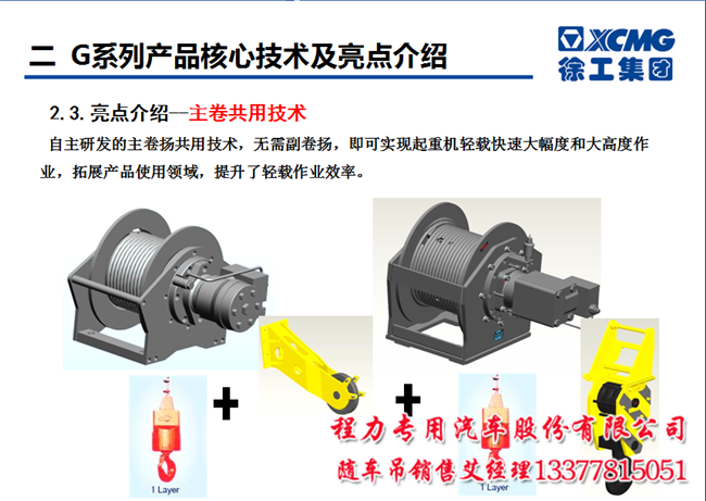 G系列產(chǎn)品核心技術(shù)及亮點(diǎn)介紹亮點(diǎn)介紹--主卷共用技術(shù).自主研發(fā)的主卷?yè)P(yáng)共用技術(shù),無需副卷?yè)P(yáng),即可實(shí)現(xiàn)起重機(jī)輕載快速大幅度和大高度作業(yè),拓展產(chǎn)品使用領(lǐng)域,提升了輕載作業(yè)效率?煽啃则(yàn)證,SQS350G樣機(jī)通過3000次強(qiáng)化試驗(yàn),無故障,完全滿足設(shè)計(jì)工況要求。
