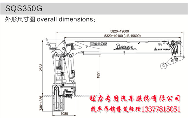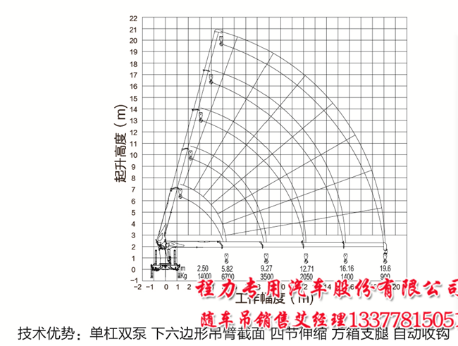 SQS350G型14噸五節(jié)加長(zhǎng)臂參數(shù):2.5米吊14噸,4.5米吊8.7噸,6.5米吊5.2噸,8.5米吊4.3噸,9.5米吊3.5噸,12.5米吊2.1噸,15.5米吊1.9噸,17.5米吊1.39噸,19.6米吊1.3噸.