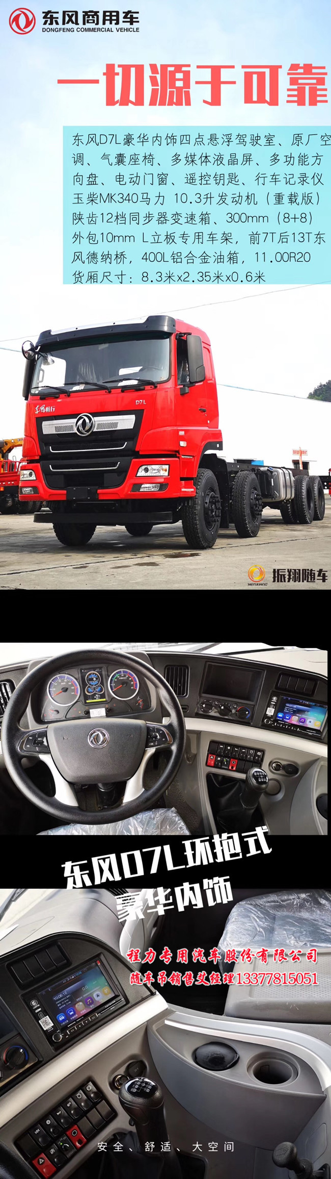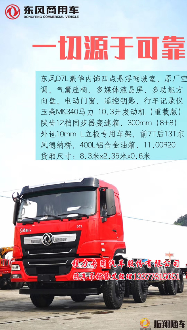 第一次看到D7L東風(fēng)暢行前四后八隨車(chē)吊底盤(pán)外包10mm立體板,是在東風(fēng)專(zhuān)底D7暢行前四后八隨車(chē)起重運(yùn)輸車(chē)再次升級(jí)_看配置:升級(jí)版D7L_13噸后橋:東風(fēng)mD7L豪華_四點(diǎn)懸浮_原廠空調(diào)_氣囊坐椅_多媒體液晶屏,行車(chē)記錄儀,玉柴FMK340馬力,10.3升發(fā)動(dòng)機(jī)重載版,陜齒12檔同步器變速箱,300大梁(8+8).外包10MM L立體板專(zhuān)用車(chē)架,前后雙7噸,13噸東風(fēng)德納橋,400L鋁合金,1100R20鋼絲胎,車(chē)廂8.3米 X 2.35米X 0.55 米或0.6 米.
