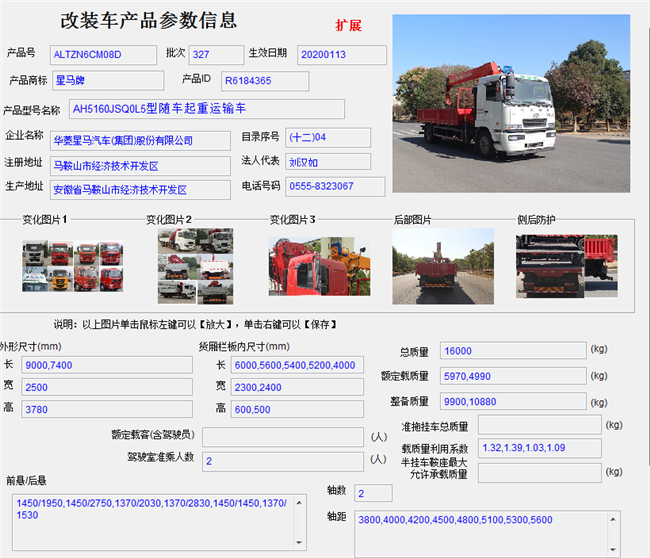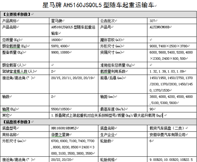 華菱隨車吊參數(shù):主要體現(xiàn)整車長(zhǎng)度,貨廂長(zhǎng)度,整車自重,行車證噸位,整車總質(zhì)量及軸距等等。星馬牌AH5160JSQ0L5型隨車起重運(yùn)輸車,總質(zhì)量(Kg)16000,額定載質(zhì)量(Kg)5970,4990,外形尺寸(mm) 9000,7400×2500,貨廂尺寸(mm)5600×2300,2400×500,駕駛室準(zhǔn)乘人數(shù)(人) 2,軸距(mm)5600,最高車速(Km/h)98,底盤型號(hào)HN1160H19E6M5J,排放標(biāo)準(zhǔn)GB17691-2005國(guó)Ⅴ,GB3847-2005YC4EG160-50