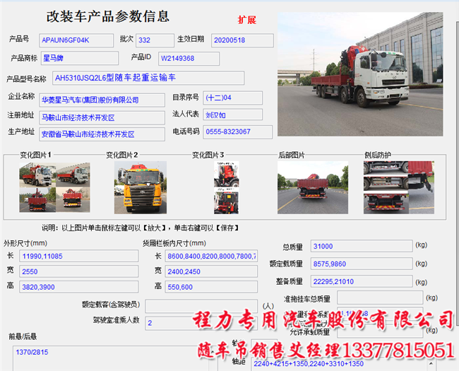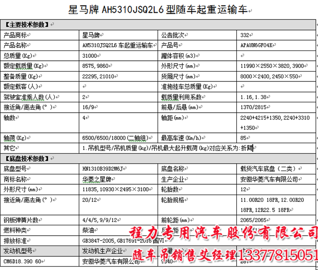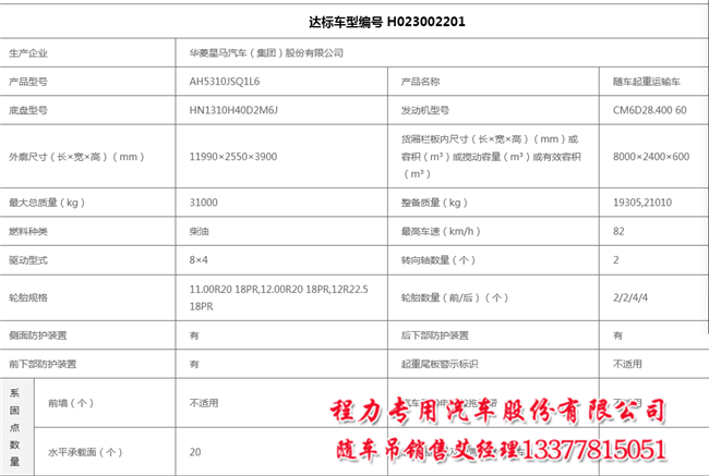 16噸18噸華菱前四后八隨車吊參數(shù):星馬牌AH5310JSQ2L6型隨車起重運(yùn)輸車,整備質(zhì)量(Kg)22295,額定載質(zhì)量(Kg)8575,外形尺寸(mm)11990×2550×3900,貨廂尺寸(mm)8200,8000×2450×550,軸距(mm) 2240+4215+1350,輪胎規(guī)格11.00R20,底盤型號(hào)HN1310B39D2M6J。