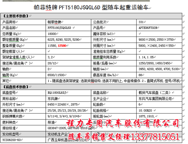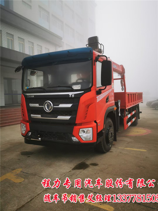 8噸10噸T5國六隨車吊配置:T702至尊版、后橋10噸、10.00R20鋼絲胎。排半車身、玉柴四缸200馬力、法士特小八檔、5100mm軸距、300mm直通三層車架、前橋5噸、中控鎖,電動玻璃,遠程油門,ABS一鍵啟動,氣管干燥劑,行車記錄儀,。自重11580kg,12580kg,車廂5800×2400,2450×550,600,型號東風華神EQ1180GL6DJ,PFT5180JSQGL6D。