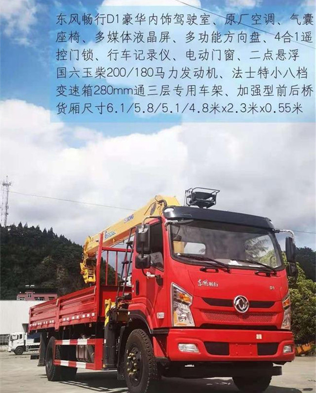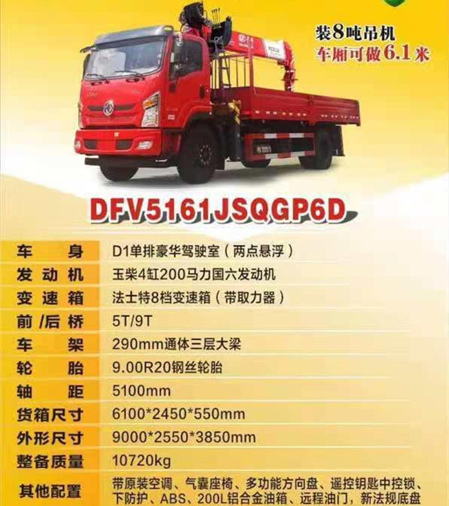 國六6米1暢行D1隨車吊_6.1米D1隨車吊_單排D1隨車吊_8噸D1隨車吊配置:D1豪華內(nèi)飾駕駛室_法士特小8擋變速箱_氣囊座椅_原廠空調(diào)_290mm通三層專用車架_9.00R20鋼絲胎_ABS_下防護_多功能方向盤_四合一遙控門鎖_二點懸浮_電動門窗_200L鋁合金油箱_前橋5T_后橋9T_多媒體液晶屏_行車記錄儀_國六玉柴200馬力發(fā)動機。