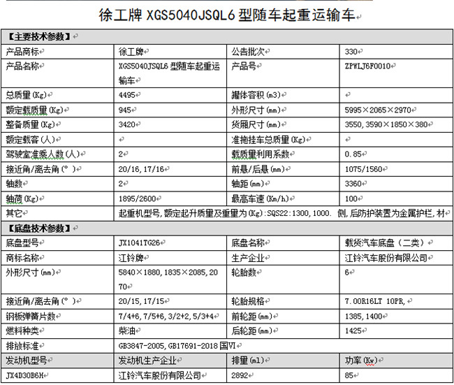 江鈴順達(dá)單排藍(lán)牌隨車吊公告展示:徐工牌XGS5040JSQL6型隨車起重運輸車_總質(zhì)量4495(Kg)_額定載質(zhì)量945(Kg)_整備質(zhì)量3420(Kg)_外形尺寸5995×2065×2970(mm)_貨廂尺寸3550×1850×380(mm) _軸距(mm)3360_ 駕駛室準(zhǔn)乘人數(shù)2(人)_發(fā)動機型號JX4D30B6H_排放標(biāo)準(zhǔn) GB3847-2005,GB17691-2018國Ⅵ。
