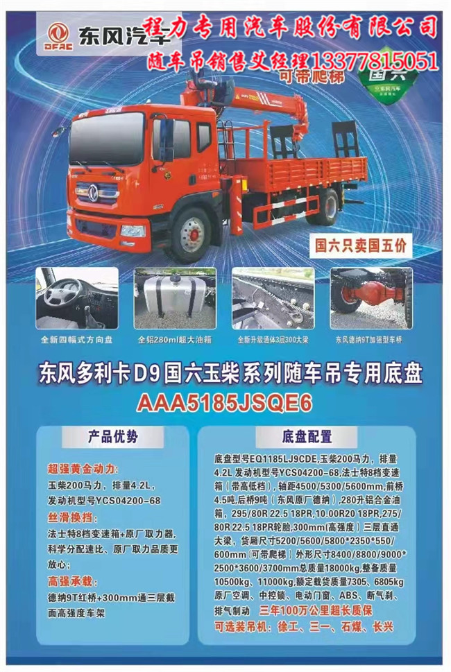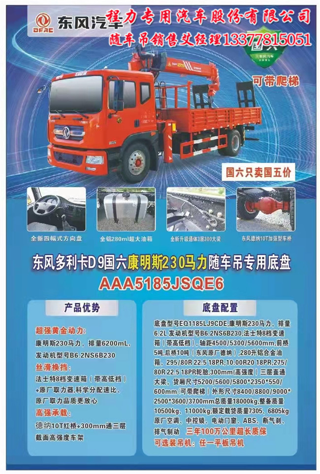 多利卡D9拉挖機(jī)隨車吊的車廂,車廂內(nèi)部尺寸5200mm,后面加一個(gè)爬梯(手動(dòng)),拉挖機(jī)貨廂加厚加固(用方筒或槽鋼),1000R20輪胎,帶空調(diào)電動(dòng)門窗,ABS,斷氣剎,排氣制動(dòng),法士特8檔變速箱,德納后橋。