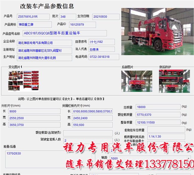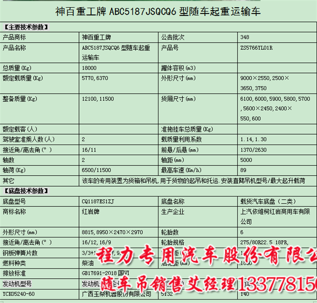 8噸上汽紅巖隨車吊配置:神百重工牌ABC5187JSQCQ6型隨車起重運(yùn)輸車,外形尺寸(mm)9000×2550×3650,貨廂尺寸(mm)5600×2450×550,總質(zhì)量(Kg)18000,額定載質(zhì)量(Kg) 5770,6370,整備質(zhì)量(Kg)12100,11500。軸距(mm)5000。最高車速(Km/h)89,底盤型號(hào)CQ1187ES1ZJ,YCK05240-60廣西玉柴機(jī)器份有限公司。