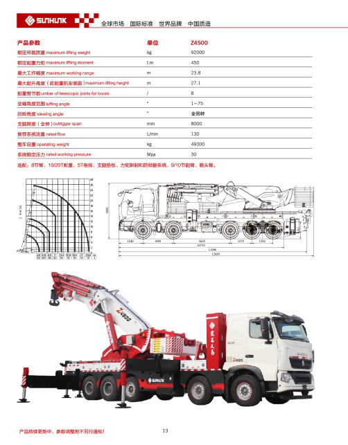 Z450型120噸宏昌天馬折臂隨車吊大臂長(zhǎng)23.8米,在4.6米吊92噸;在6.8米吊60噸;在8.9米吊45噸;在11米吊32噸;在13.4米吊24噸;在15.8米吊19噸;在18.4米吊16噸;在21米吊14噸;在23.8米吊12噸;