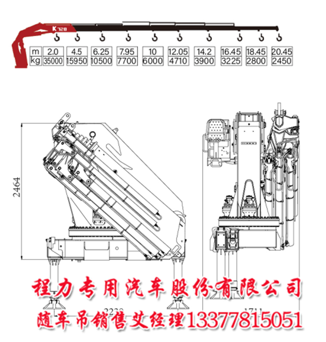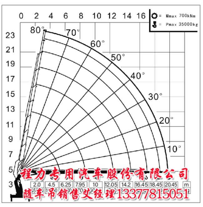 35噸宏昌天馬折臂隨車吊大臂長(zhǎng)20.45米,在2米吊35噸;在4.5米吊16噸;在6.25米吊10噸;在8米吊7.7噸;在10米吊6噸;在12米吊4.8噸;在14米吊3.9噸;在16.5米吊3.2噸;在18.5米吊2.8噸;在20.45米吊2.45噸;