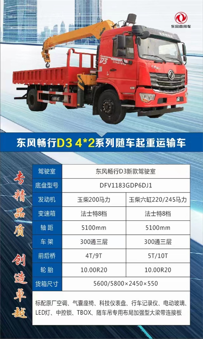 8噸東風(fēng)風(fēng)暢行D3隨車吊配置講解:D3國(guó)六隨車吊標(biāo)配有帶原廠ABS、日行燈、中控鎖、遙控鑰匙、下防護(hù)。電動(dòng)玻璃、氣囊座椅、原廠空調(diào),車廂可選5.6米與5.8米,六缸玉柴220馬力,300直通三層車架,