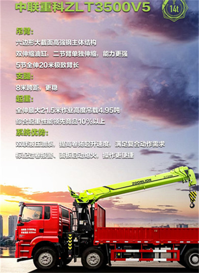了解中聯(lián)14T隨車吊中聯(lián)重科14t中聯(lián)前四后八隨車吊吊機(jī)優(yōu)勢(shì),中聯(lián)吊機(jī)全國用戶應(yīng)該都很了解吧,產(chǎn)品14噸五節(jié)中聯(lián)吊機(jī)的優(yōu)點(diǎn)有:系統(tǒng)優(yōu)勢(shì):雙聯(lián)液壓出泵,提高卷揚(yáng)起升速度,滿足復(fù)合動(dòng)作需求標(biāo)配過卷報(bào)警、面板啟動(dòng)熄火,操作更便捷z0OMLION310001gI :600m吊管:六邊形大截面高強(qiáng)鋼主體結(jié)構(gòu)雙伸縮油缸,二節(jié)臂單獨(dú)伸縮,能力更強(qiáng)5節(jié)全伸20米極致臂長。支腿8米跨距,更穩(wěn),起重:全伸最大21.5米作業(yè)高度吊載4.95噸綜合起重性能領(lǐng)先競(jìng)品10%以上。