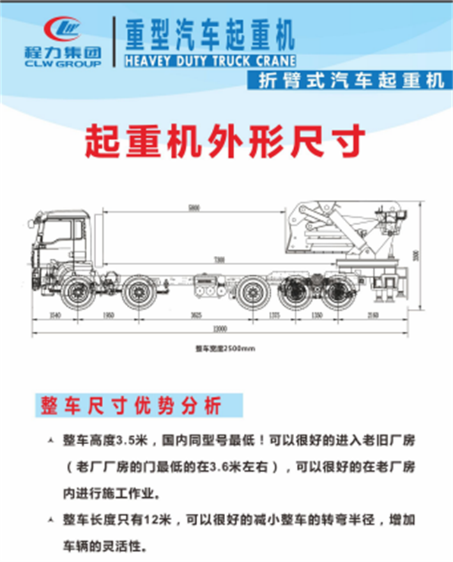 大臂中置,吊載更穩(wěn)定,多連桿結(jié)構(gòu),變幅更大大臂可翻轉(zhuǎn)180,回一變幅油缸采用雙缸結(jié)構(gòu),支撐更穩(wěn)定。整車尺寸優(yōu)勢分析人整車高度3.5米,國內(nèi)同型號最低!可以很好的進入老舊廠房(老廠廠房的門最低的在3.6米左右),可以很好的在老廠房內(nèi)進行施工作業(yè)。人整車長度只有12米,可以很好的減小整車的轉(zhuǎn)彎半徑,增加車輛的靈活性。