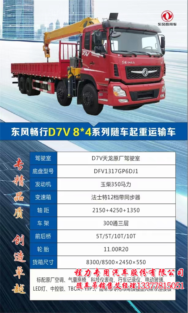 東風(fēng)D7V暢行前四后八隨車吊配置:發(fā)動機(jī):YCK08350-60,400L鋁金合油箱、華駕駛室D7V平豪頂,四懸點(diǎn)浮,中控鎖,一式體后視鏡氣座囊椅,法特士變速箱(12JSD160TA),原德裝納前后橋5T/10T,300通層三大梁,儲氣筒,鋼絲胎11.00R20,原裝牌品?空調(diào),電降升門窗。