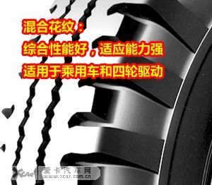 混合花紋是普通花紋和越野花紋之間的一種過渡性花紋。其特點是胎面中部具有方向各異或以縱向為主的窄花紋溝槽,而在兩側(cè)則以方向各異或以橫向為主的寬花紋溝槽。這樣的花紋搭配使混合花紋的綜合性能好,適應(yīng)能力強(qiáng)。它既適應(yīng)于良好的硬路面,也適應(yīng)于碎石路面、雪泥路面和松軟路面,附著性能優(yōu)于普通花紋,但耐磨性能稍遜。目前,一些貨車和四輪驅(qū)動的乘用車多使用這種型式的花紋輪胎。