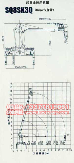 SQ8Z3Q噸四節(jié)折臂吊機(舉升高度13米 ,工作半徑9.86米) 最大起重量是8T,最小起重量是1.25噸 SQ8SK3Q噸四節(jié)直臂吊機(舉升高度13.5米 ,工作半徑11.5米) 最大起重量是8T,最小起重量是1.1噸