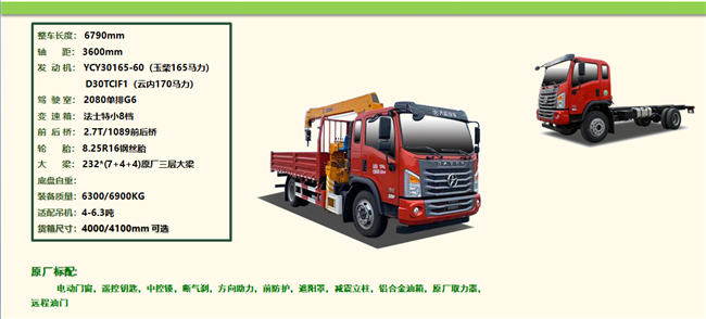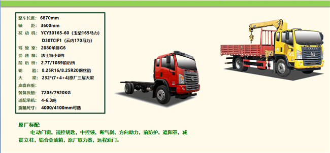 4米短車廂大運隨車吊3.6米短軸距隨車吊配置:DYQ5111JSQD6AB,原廠局部三層大梁,160L鋁合金油箱,軸距3600,4000*2300*600廂,2080新款G6單排駕駛室,2.3/7噸縮短橋,8.25R16鋼絲胎,200×(7+4+4),D25TCIF1,云內(nèi)150馬力發(fā)動機,萬里揚六檔帶副變速箱。