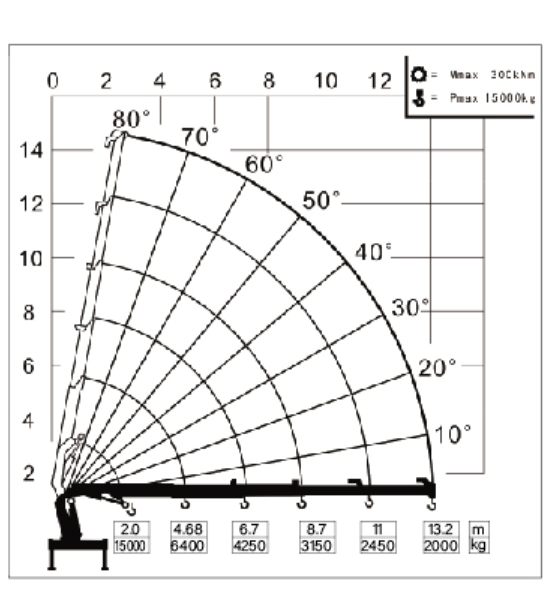 15噸宏昌天馬折臂隨車吊吊參數(shù):大臂長(zhǎng)13.2米,