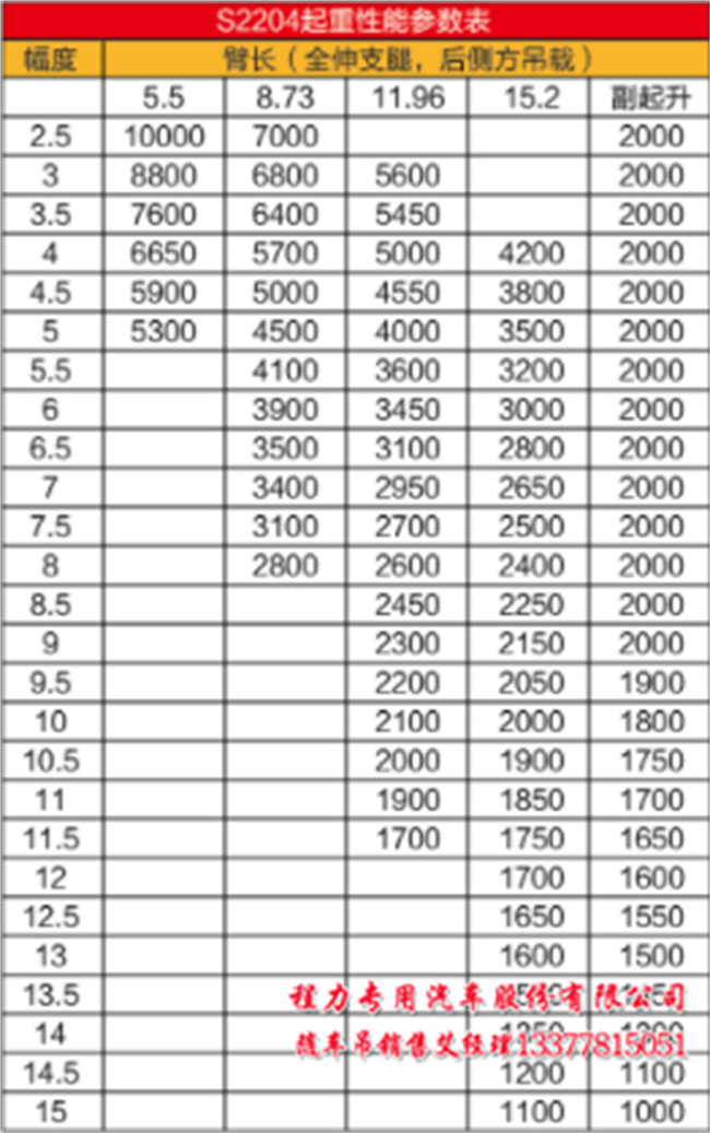 底盤型號:S2204起重參數(shù)表 額定質(zhì)量:宏昌天馬10噸隨車吊吊機S2204
