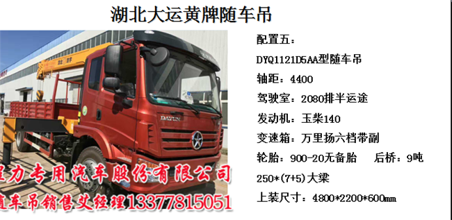 大運隨車起重運輸車4400軸距.玉柴140馬力.2080排半運途駕駛室,萬里揚六檔帶副變速箱,9噸后橋,8.25R20鋼絲胎,250*(7+5)原廠局部三層大梁