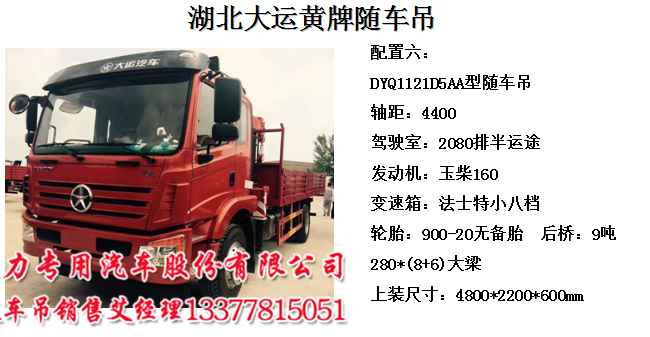 湖北大運隨車吊配130馬力140馬力160馬力180馬力發(fā)動機可選,吊機配10噸-3.2噸直折臂,車廂是與大運隨車吊軸距相關(guān),軸距長,車廂長,你要哪一款大運隨車吊?