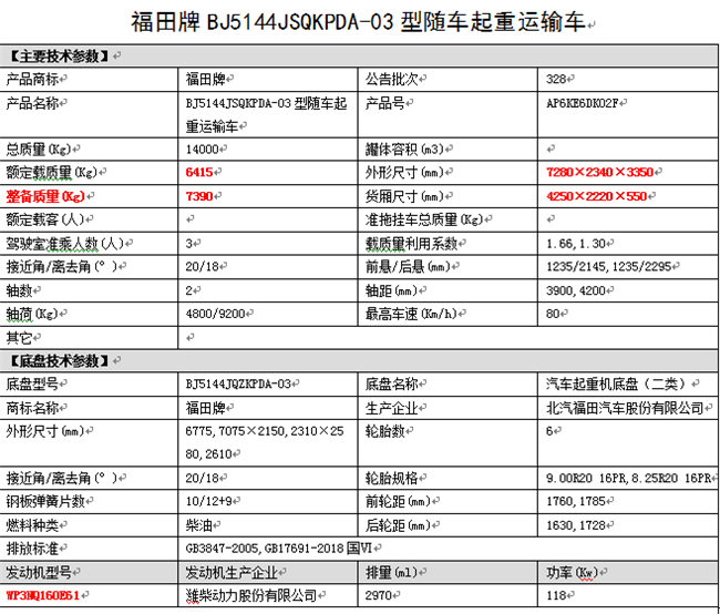 5噸6.3噸福田瑞沃隨車吊公告參數(shù)