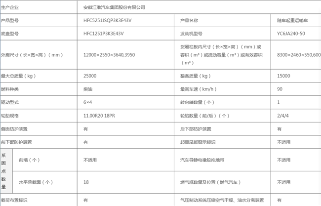 HFC5251JSQP3K3E43V12噸14噸后雙橋江淮隨車吊配置 :格爾發(fā)K6L半高頂駕駛室,法士特8檔變速箱(8JS105),前橋5t,后橋153,302×80×(8+4)車架,11.00R20 16PR輪胎,300L鐵油箱。5800+1350,12000×2550×3850.玉柴  YC6JA240-50.