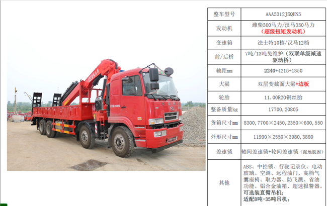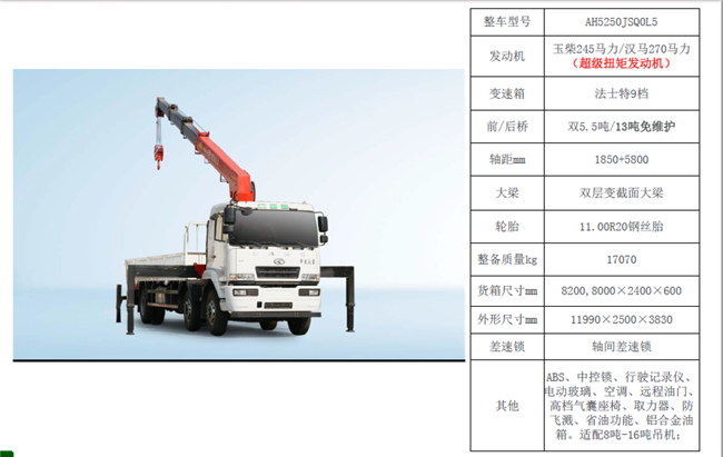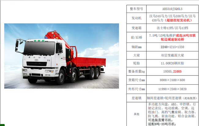 五軸重型起重機配置:AAA5530JQZHN6(10X4,五軸,國六),1850+3725+1375+1350,漢馬460馬力,電動門窗,中控鎖,斷氣剎,原廠空調,高檔豪華氣囊座椅,多功能方向盤,液晶顯示屏,遙控鑰匙,節(jié)油開關?傎|量:53噸。底盤型號:HN5530A46C7M6J(可改平板運輸車、起重機),12.00R2020PR,前橋7.5噸,中間采用浮動橋,雙后橋16噸,士特12檔