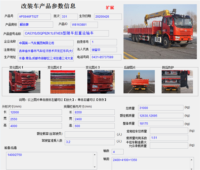 16噸前四后八解放隨車吊其它 起重機型號,最大起升載荷及質(zhì)量分別為(Kg): SQS300:12000,4800側(cè)后防護為金屬護欄,材料Q235,側(cè)防護連接方式為螺栓連接,后防護連接方式焊接,后防護離地高度460mm,截面高度130mm,截面寬度70mm.選裝欄板形式,選裝操縱座椅形式.選裝后支腿.已安裝具有衛(wèi)星定位功能的行駛記錄儀.ABS系統(tǒng)生產(chǎn)廠家:長春瑞立科密汽車制動有限公司,型號:CM4XL;選裝限速裝置,限速89km/h,選裝寬體保險杠,腳踏板 .隨車起重機主要由水平支腿,垂直支腿,轉(zhuǎn)向基座和起重吊臂組成,主要用于實現(xiàn)貨物自行裝卸的起重舉升.選用發(fā)動機CA6DK1-32E6 、CA6DK1-28E6.油耗值都為36.17(L/100km).